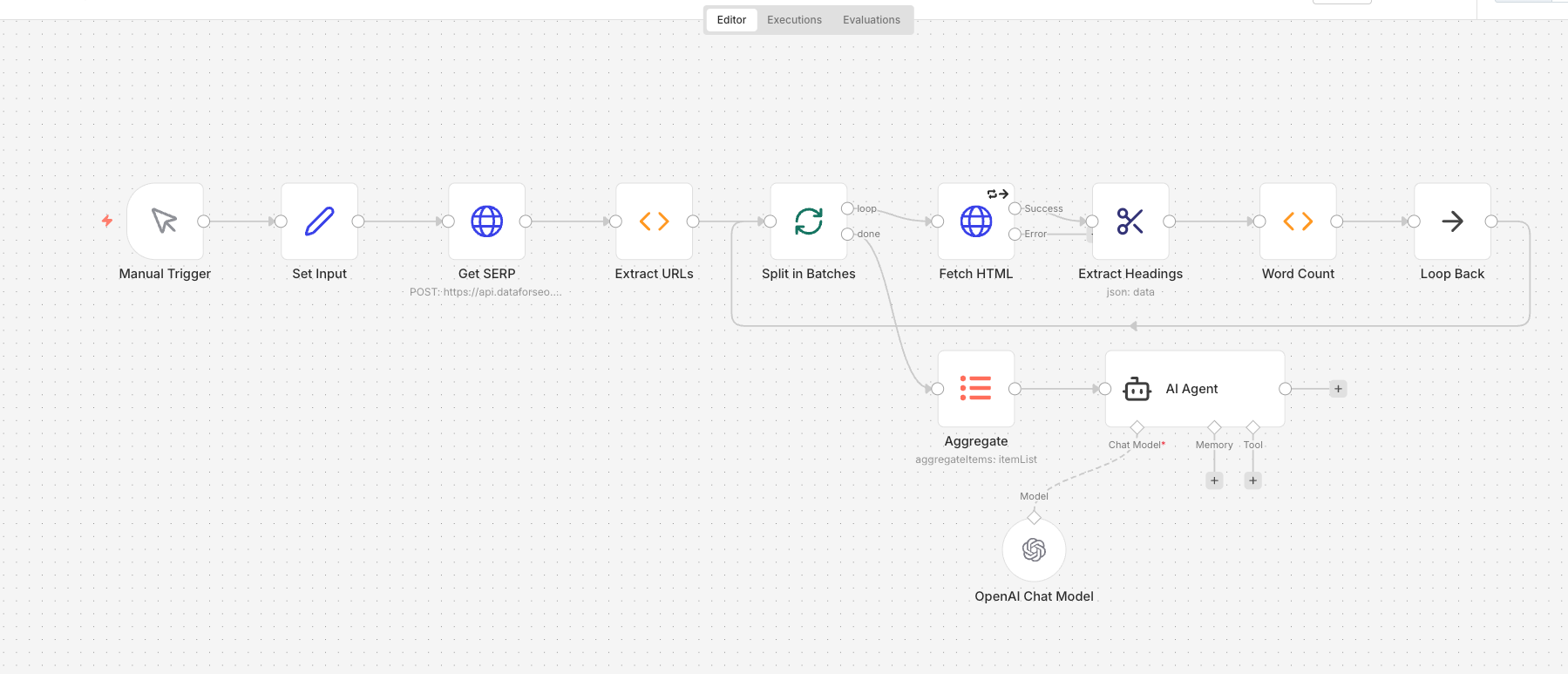 This automation analyzes the current top-ranking pages in Google, reverse engineers their content structure, and uses AI to generate a comprehensive SEO content brief designed to outperform them.